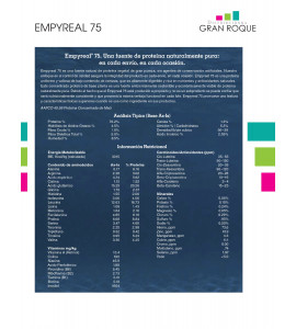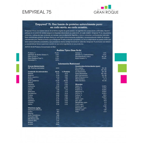 Empyreal 75 es una fuente natural de proteina vegetal de gran pureza, sin agentes de conservación artificiales. Nuestro enfoque en el control de calidad asegura la integridad del producto en cada envío, en cada ocasión. Empyreal 75 es una proteina uniforme y valiosa de bajo contenido de cenizas, que es altamente digerible y rica on nutrientes y antioxidantes naturales, Este concentrado proteico de base planta es una fuente ambientalmente sostenible y económicamente viable de proteina naturalmente pura. Debido al hecho que el Empyreal 75 está producido a propósito y no es un subproducto se puede confiar que será nutricionalmente consistente y que proveerá la misma vontaja funcional en cada lote. Empyreal 75 promueve una textura y caracteristicas físicas superiores cuando se usa como ingrediente en sus productos.